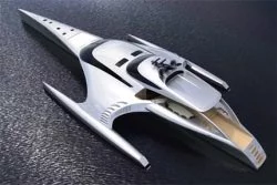 Heraus kam eine Yacht mit einem einmaligen Design aus drei Rümpfen, ein sogenannter Trimaran. Noch nie zuvor wurde bisher ein Trimaran als Luxusyacht konzipiert. Das 42,5 Meter lange Schiff gleitet elegant durch das Wasser und schafft dabei mit nur einer Tankladung eine Strecke von rund 4.000 nautischen Meilen. Eine Reise von New York nach Großbritannien wäre damit möglich.