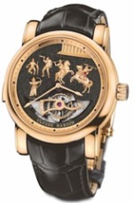 Das Gehäuse ist 44 Millimeter groß und besteht aus 18 Karat Weißgold oder Rotgold. Auf dem Diamantzifferblat sieht man fünf handgearbeitete Szenen, die Alexander den Großen sowie andere Krieger zeigen. Ein besonderes Highlight ist die sichtbare Minutentourbillon, die in das Zifferblat integriert ist. Die Tourbillon-Brücke ist noch genauso gehalten wie sie einst James Pellaton Anfang des 20. Jahrhunderts für Ulysse Nardin anfertigte.