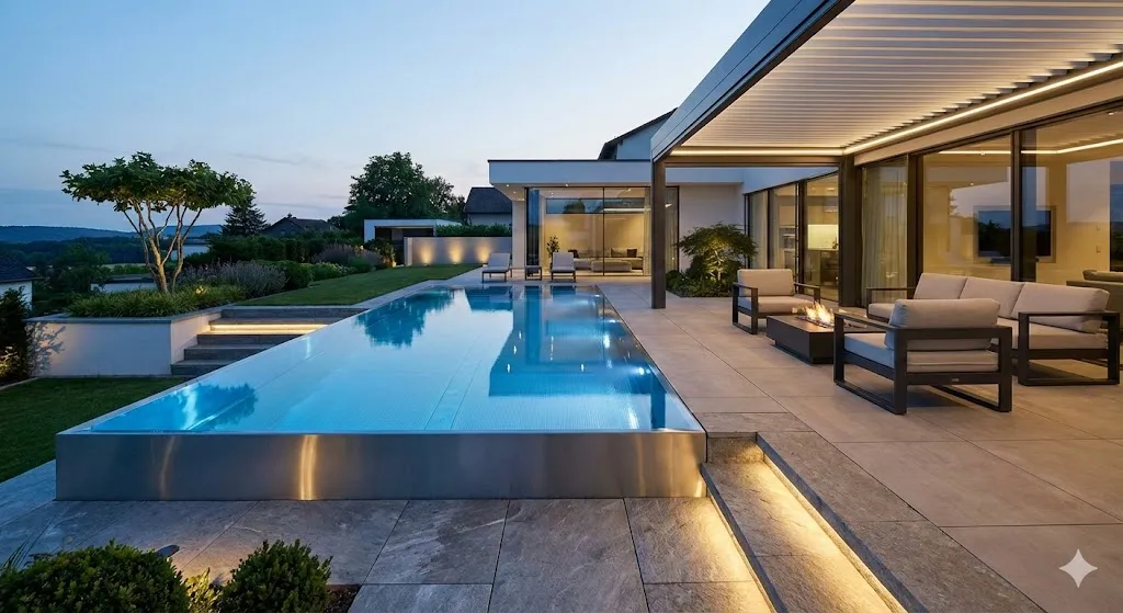Materialität ist tragend und Edelstahlbecken haben sich als langlebig, chlorbeständig und formal klar herausgestellt: ihrer Planung und Ausführung bedarf es aber zwingend. Betonbecken mit Sichtbeton oder hochrangigen Fliesen- und Natursteinoberflächen erlauben die Ausformung individueller Geometrien, verlangen aber sorgfältige Abdichtung und auf Frost- und Chemikalienbeständigkeit abgestimmte Oberflächen. Naturstein, Keramikplatten und Glasmosaik kommen im Umfeld zum Zuge, um Haptik, Rutschhemmung und optische Tiefe zu steuern.