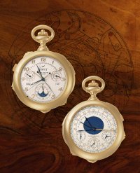 Die komplexeste Taschenuhr der Welt besteht aus 1.728 Einzelteilen, darunter 24 Zeiger und 12 Hilfszifferblätter auf der Vorder- und der Rückseite. Die 33 Komplikationen sind auf einem Zifferblatt für Normalzeit und einem für Planetenzeit abzulesen.