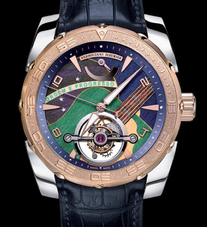 Leuchtendes Gelb und Grün stehen für Bewegung, Tanz und Freude am Leben. Diese Nuancen bilden die Grundlage dieser luxuriösen Uhr. Darüber hinaus hat Parmigiani Fleurier weitere Details eingearbeitet, die aus der Watch ein wahres Schmuckstück machen. Brasilien ist auch ein Land der Musik. Aus diesem Grund haben die Uhrenmacher eine Gitarre unter das Ziffernblatt gearbeitet.