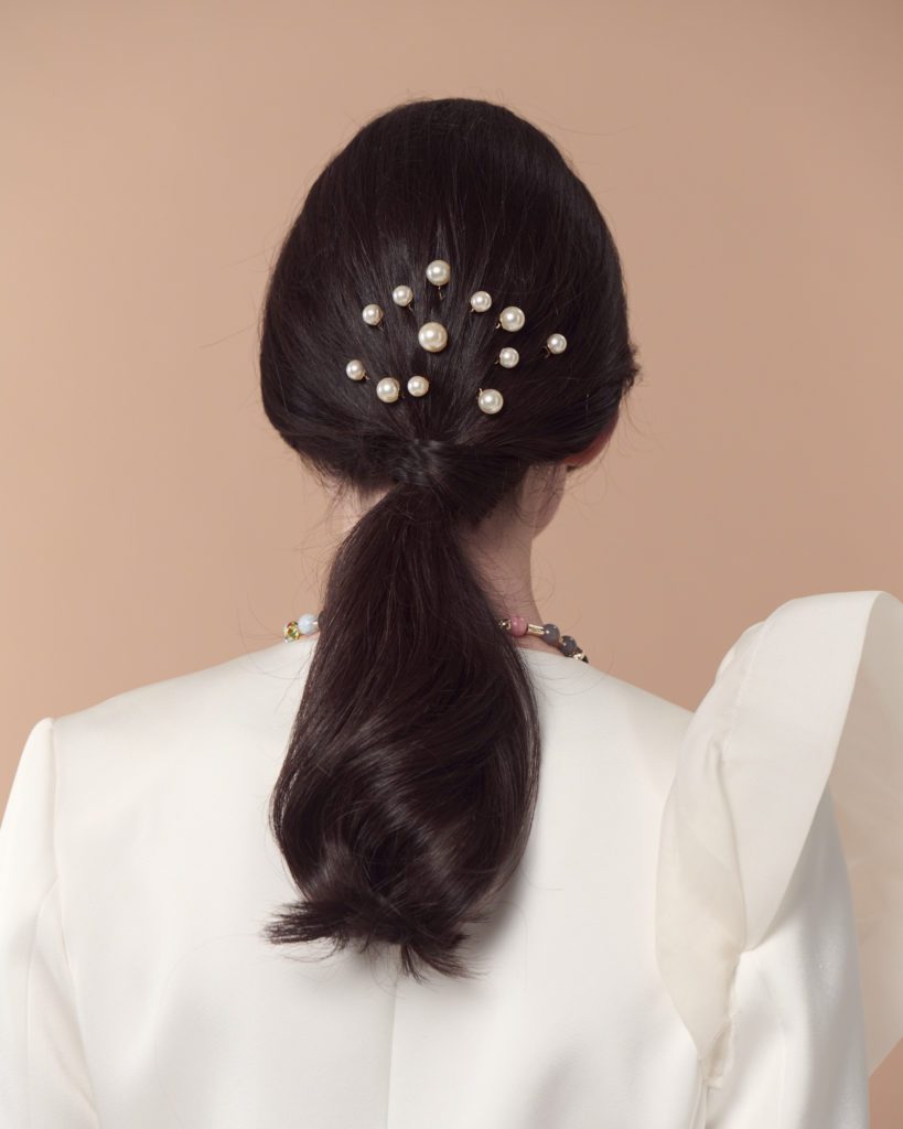 Die schlicht schimmernde Eleganz von Perlen ist zeitlos und gehört bei den Accessoires einer Braut schon fast zu den Must-Haves. Perlen sind die perfekte Ergänzung zu zurückhaltenden Frisuren, wie einem Low Ponytail. Mit dem Brautschmuck für die Haare wird der Stil des Kleides erneut aufgegriffen und der Look auf subtile, aber edle Weise ergänzt.