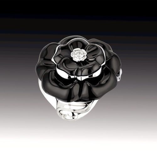 Heraus kamen zwölf verschiedene Kreationen, vom Ring über Ketten und Armbänder bis hin zu Ohrringen, die alle mit dem Symbol der Kamelie spielen. Die Stücke wurden aus Keramik gefertigt, das feiner als Porzellan, aber dabei robuster ist. Hinzu kommen 18-karätiges Weißgold und Diamanten.