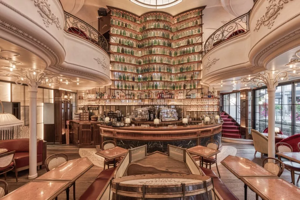 So beginnt das Märchen, das die Gastronomen Lydie und Laurent Mougenot mit der Renovierung des traditionsreichen, ehemaligen Lokals „La Terrasse“ im Zentrum von Chamonix weiterschrieben. Nun heißt der mittlerweile beliebte Insta-Spot „Rose du Pont“ – Rosa der Brücke, eine Referenz auf die prächtige Fassade. Um dem 700 m² großen Haus neues Leben einzuhauchen, hat der Architekt und Innenarchitekt Christophe Bro beschlossen, den Charme des historischen Interieurs beizubehalten und gleichzeitig einen zweiten Raum mit einer einzigartigen zeitgenössischen Note zu schaffen. Von außen erstrahlt die Fassade in der Farbe Rosa. Im Inneren wird der Jugendstil mit Mosaikfresken, Glaspastenkreationen und Stuckarbeiten gewürdigt. Der Pariser Architekt kreierte zudem eine monumentale Bar aus Marmor und geschnitztem Holz, hinter der sich eine mit Flaschen gefüllte Kathedralenbibliothek befindet, die die gesamte Höhe des Cafés beherrscht. Und natürlich ist das Lokal nicht nur optisch, sondern auch kulinarisch ein absolutes Highlight.