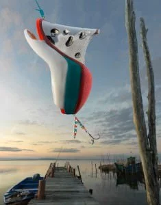 Der Mode-Maestro ist für seine verspielten Schuh-Designs bekannt. Die neue Frühling/Sommer-Kollektion 2013 beweist seine Liebe zum Spiel. Farbenfroh und magisch setzt er seine neuesten Werke in Szene. Die Bilder wurden in einem surrealistischen Stil bearbeitet. Sie erinnern an die Werke des Künstler Rene Magritte. Die Schuhe glänzen vor einem Hafen, neben Fischnetzen und weiteren Meeres-Utensilien.