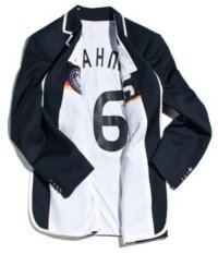 Außen ist es ein modisches Sakko, jedoch in der Innenseite ist ein Trikot von Philipp Lahm eingenäht. Wendet man also das Sakko, ist man gleich perfekt für das nächste Public Viewing gekleidet. Mit Sicherheit ein echter Hingucker und ein schönes Zeichen. Von der Arbeit direkt auf die Fanmeile.