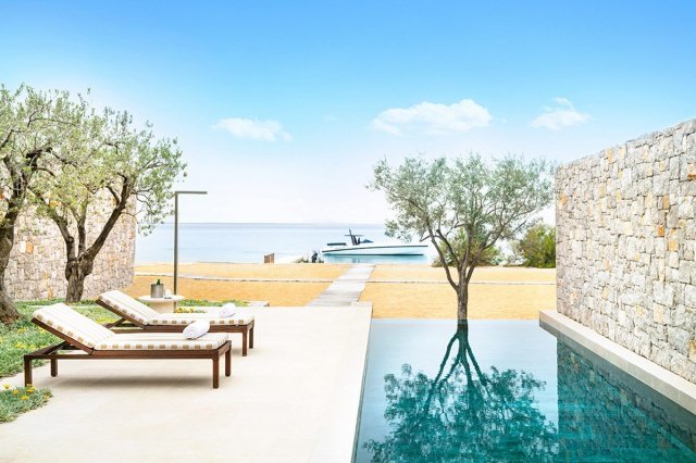 Das neue Resort der Aman Hotelgruppe liegt etwa 10 Minuten von Porto Heli entfernt, einem pulsierenden Ort an der Ostküste des Peloponnes. Den Gast empfängt ein Ort absoluter Ruhe, in herrliche Olivenhaine eingerahmt, mit einem Blick auf malerische Buchten und den Beachclub des Resorts.