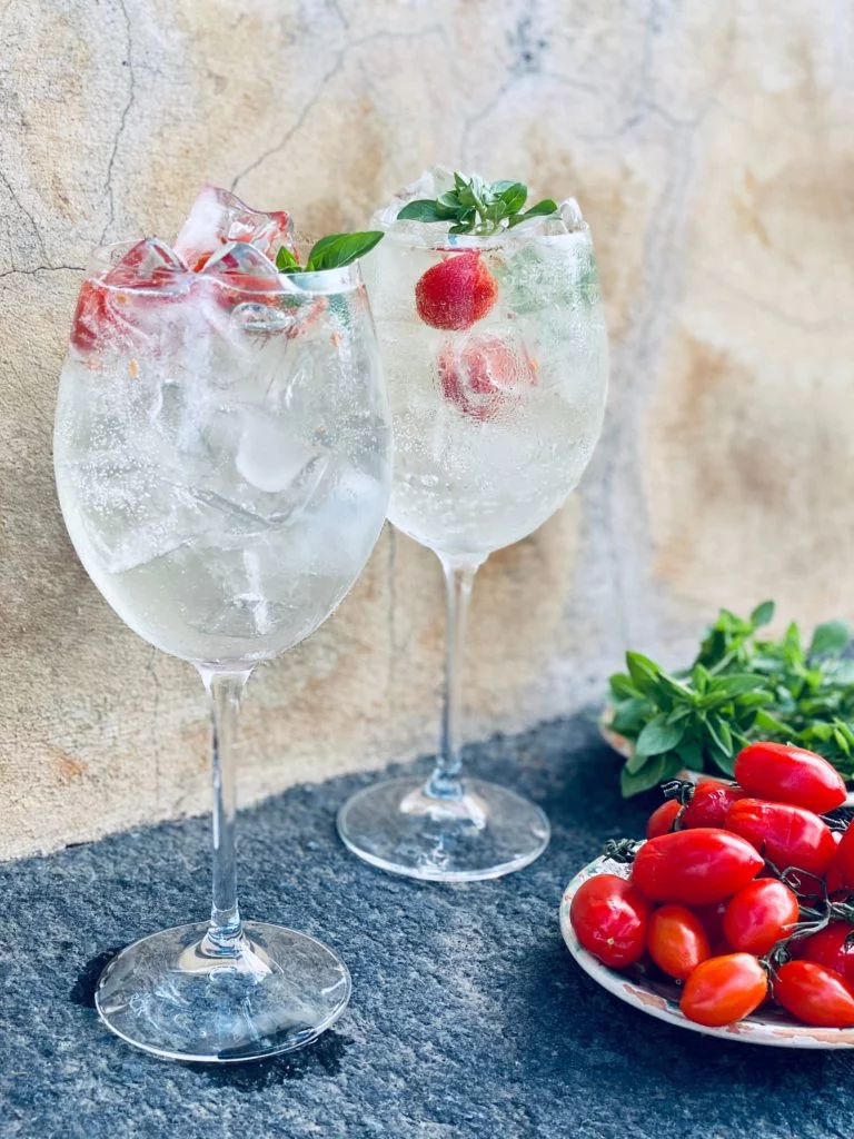 So geht der italienische Drink: Zwei große Rotweingläser mit Eiswürfeln füllen, Gin mit Basilikumblättern und Eiswürfeln kräftig schütteln und in die Gläser gießen. Tonic Water ins Glas geben, zwei Tomaten hineinpressen und zwei weitere zur Dekoration hineinlegen. Eiswürfel dazu, mit Basilikumblättern dekorieren, und: salute!