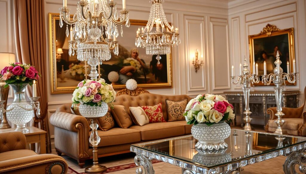 Zu den luxuriösen Wohnaccessoires zählen unter anderem kristallene Vasen und Dekorationen, handgefertigte Kunstobjekte sowie exklusive Beleuchtungselemente wie Kronleuchter und Designerlampen.