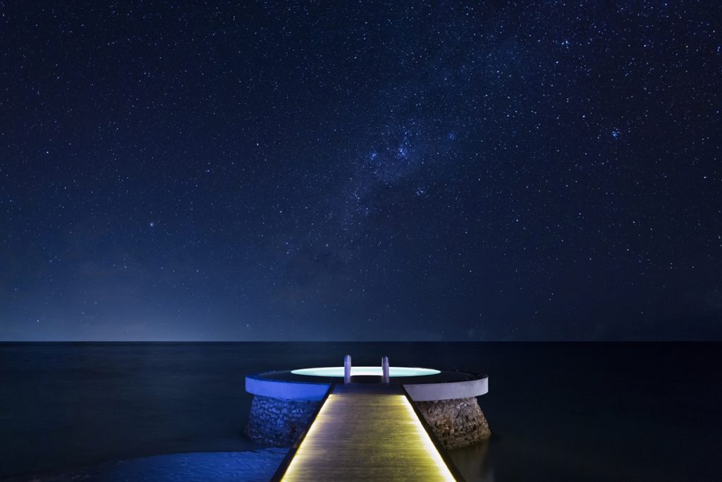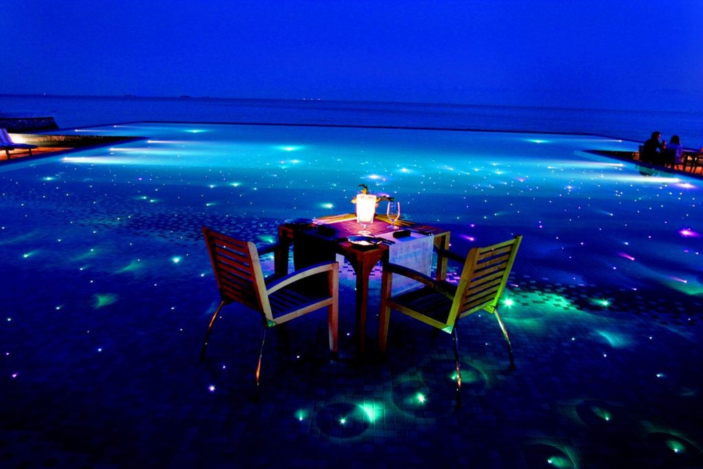 Ein Dinner der Extraklasse wartet im Huvafen Fushi auf den Malediven auf Pool-Begeisterte: Unter und gleichzeitig wie auf dem Sternenhimmel sitzend, serviert das Hotel-Restaurant Köstlichkeiten. Denn der Infinity Pool wird nachts mit Spots beleuchtet, so dass ein Abendessen auf dem noch nicht mit Wasser bedeckten Teil des Beckens ein magisches Gefühl vermittelt. Daneben verfügt das Resort über weitere spektakuläre Badegelegenheiten, wie etwa ein Whirlpool mitten im Meer sowie luxuriöse Privat-Villen mit eigenen Pools.