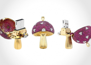 Die Designer wurden von der Alice im Wunderland inspiriert, als sie das Juwel mit Computerschnittstelle schufen. Auf den ersten Blick wirkt der Pilz wie ein teures Schmuckstück. Erst wenn man den schillernden Hut herunterklappt, kommt der USB-Slot zum Vorschein. 18 karätiges Weißgold bedeckt den Pilz. Weiße Diamanten und Smaragde sorgen für das richtige Funkeln.