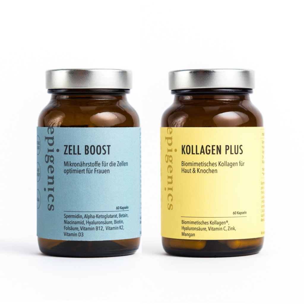 Mit der Kombination seiner Kapsel-Präparate „Kollagen Plus“ und „Zell Boost“ hat Epigenics ein ganzheitliches Anti-Aging-Konzept entwickelt. Durch dieses sollen Selbstreinigungsprozesse auf der Zellebene angestoßen werden.