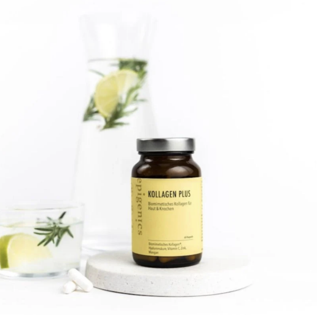 Ich verordnete mir infolge dieser Überlegungen und Erkenntnisse eine zweimonatige Kapsel-Kur mit „Zell Boost“ und „Kollagen Plus“ von Epigenics. Besonders hat mich überzeugt, dass es sich bei „Kollagen Plus“ um biomimetisches und veganes Kollagen handelt. Biomimetisch bedeutet: die Natur nachahmend. Also ein Kollagen, das so naturgetreu und naturidentisch ist wie möglich. Die „Kollagen Plus“-Kapseln von Epigenics enthalten alle 18 Aminosäuren, die auch im menschlichen Kollagen enthalten sind.