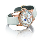 Sternzeichen der Zeit: Mit der „Cat’s Eye Zodiac“ präsentiert Girard-Perregaux erstmals eine Uhr, die das Ablesen des aktuellen Tierkreiszeichens ermöglicht. Durch Aussparungen im schimmernden Ziffernblatt aus Perlmutt zeigen sich die zwölf Sternzeichen, die entsprechend an den Monaten vorbei ziehen. Ergänzt wird der Jahreskalender durch das Datum – eine ausgeklügelte Mechanik, die die verschiedenen Monatslängen berücksichtigt und automatisch korrigiert. Die unverkennbare, leicht ovale Form in Gold verleiht der Cat’s Eye Zodiac Extravaganz, für den Glamour sorgen 68 Diamanten auf der Lünette – so funkeln nicht nur die Sterne am Himmel.