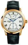 Glashütte Original Senator Chronometer eingehüllt in warm schimmerndem Roségold Klassisch mutet die Schau aufs Zifferblatt des Senator Chronometers an, erinnert sie doch an die charakteristischen Anordnungen von Taschenchronometern. Das silberne Zifferblatt beherbergt die dezentrale Sekunde und die Gangdaueranzeige in einer Linie zum Zentrum. Letztere befindet sich auf zwölf Uhr und zeigt die echte restliche Gangdauer der Uhr stundengenau an. Die für Glashütte Original typische Anzeige des Panoramadatums wurde auf 3 Uhr platziert. Durch eine durchdachte Weiterentwicklung gelang es den Konstrukteuren, dass der Datumssprung um 24 Uhr stattfindet. Um die Uhrzeit in Bezug zum Datumssprung leichter einstellen zu können, wurde das Uhrwerk mit einer Tag-Nacht-Anzeige versehen. Von 6 Uhr Früh bis 18 Uhr Abend erscheint der kleine Kreis zwischen der Gangdaueranzeige und dem Zentrum des Senator Chronometers weiß, nach 18 Uhr bis 6 Uhr Früh ist die Anzeige hingegen schwarz.