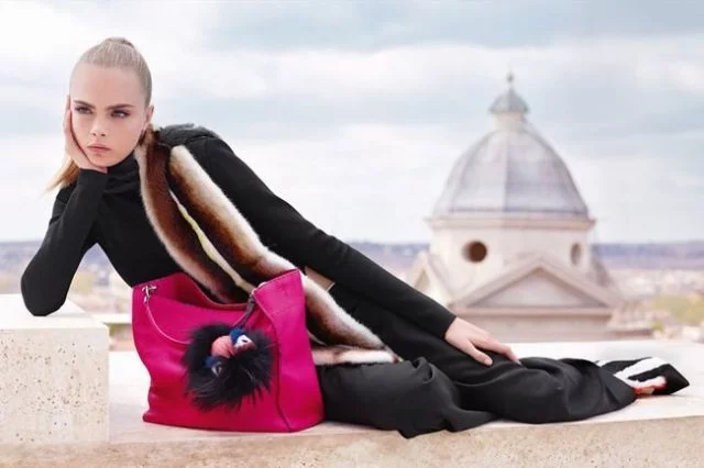 Die ersten Bilder zeigen Cara Delevingne unter anderem wie sie über den Dächern der Stadt liegt. Dabei trägt sie einen Mantel aus Stoffelementen und grauem Fell. Kombiniert wird dieser mit einer Handtasche von Fendi in leuchtendem Magenta.