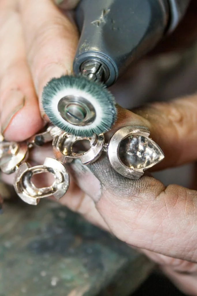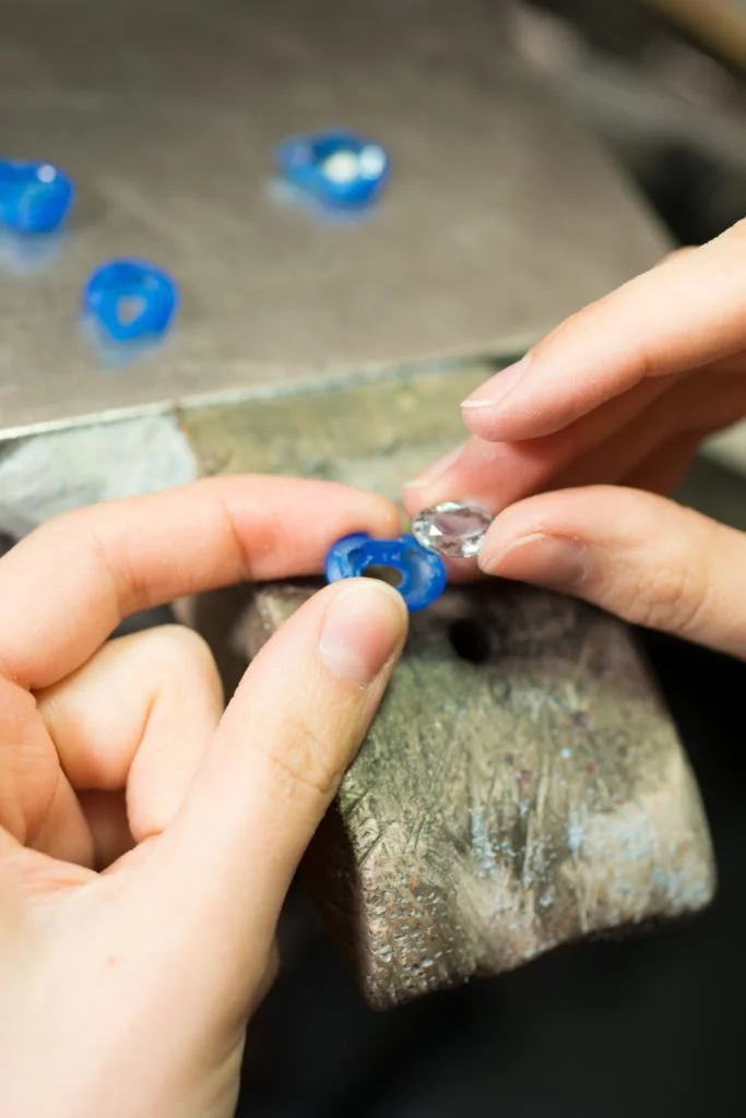 Die Bestandteile Gold, Silber und Palladium für eine 18 Karat Weißgoldlegierung werden zusammengeführt. Die Goldlegierung wird geschmolzen und gleichmäßig vermischt. Die über 1000 Grad Celsius heiße Goldschmelze wird in die in Gips eingebetteten Wachsfassungen eingegossen. Durch die Hitze schmilzt das Wachs, das Weißgold ersetzt nun die Form und bildet die Fassungen. Jede einzelne Fassung wird vorpoliert und durch sogenannte Ösen-Bewegungen mit den anderen verbunden. Auch das Innere der Fassungen wird poliert, um die Lichtreflexion der Edelsteine zu unterstützen. Thomas Jirgens justiert die Aquamarine passgenau und fasst sie in das Weißgold. Dabei überprüft er Qualität und Präzision erneut. Die Diamanten werden rund um die Aquamarine gesetzt.