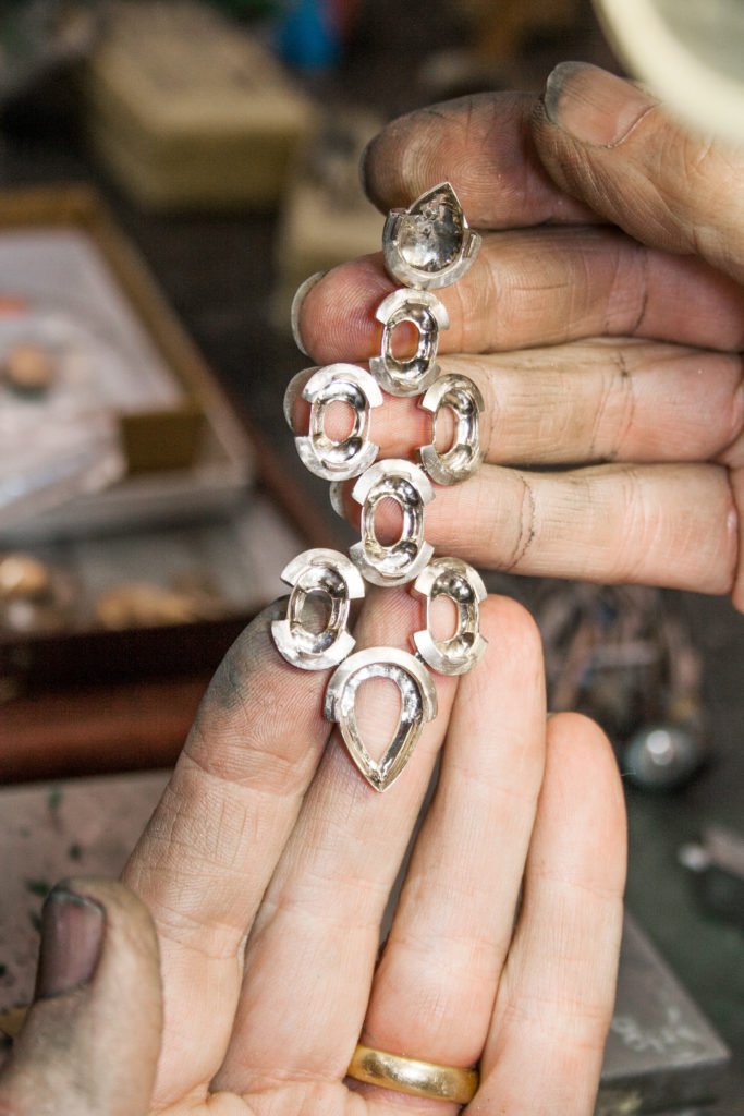 Bis ein Paar Ohrhänger wie diese fertig sind kann es schon mal dauern. Das liegt vor allem an den Steinen, die in der passenden Größe und Farbe erst gefunden werden müssen. Aber auch die Handarbeit, vor allem das Fassen der Juwelen, verschlingt 250 Stunden. Jeder Stein ist ein Einzelstück in Form und Schliff. Deshalb wird für jeden Stein eine eigens für ihn geformte Fassung aus Wachs angepasst. Ist die Form der Fassung für jeden Stein geschaffen, wird sie von innen ausgehöhlt, um das Gewicht so gering wie möglich zu halten. Die Passgenauigkeit jeder Fassung zu ihrem Stein wird ein letztes Mal überprüft und verfeinert.