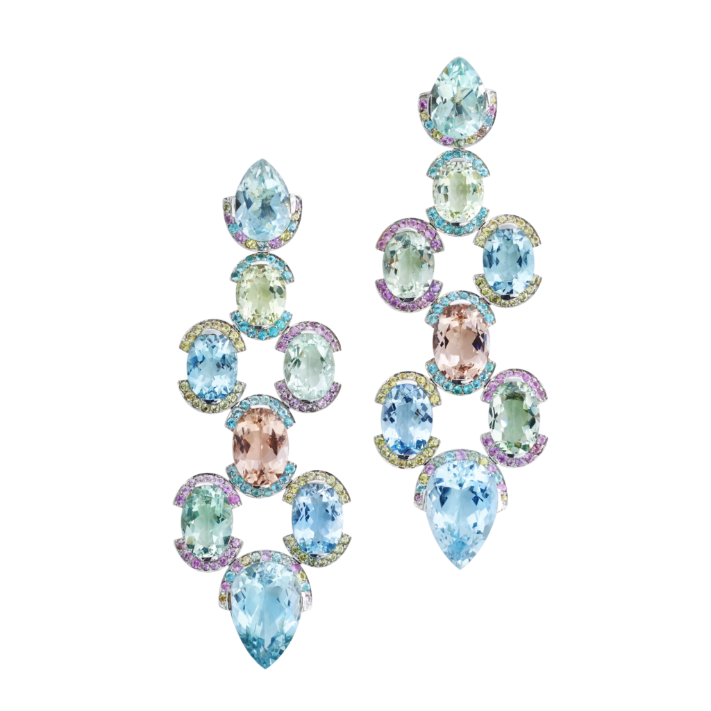 Mit ihrem Schmuck ermutigt Katerina Leroy die Frauen, das zu werden, was sie sind: glanzvoll, frei, sinnlich, voller Leben. Eine zugleich moderne und selbstsichere Frau, die Diamanten sowohl als Begleiter im Alltag als auch für die schönsten Momente des Lebens wählt. Eins ihrer Liebslingsschmuckstücke ist „Pastella“ Ohrringe, aus Goldberylle, Aquamarine und Morganite in Pastellfarben, die die Farbvielfalt des Edelsteins Beryll am schönsten zur Geltung bringen. Die Saphire und Paraiba Turmaline harmonieren perfekt mit der Augenfarbe ihrer Trägerin und betonen die natürlichen Gesichtszüge durch die oval facettierten Berylle.