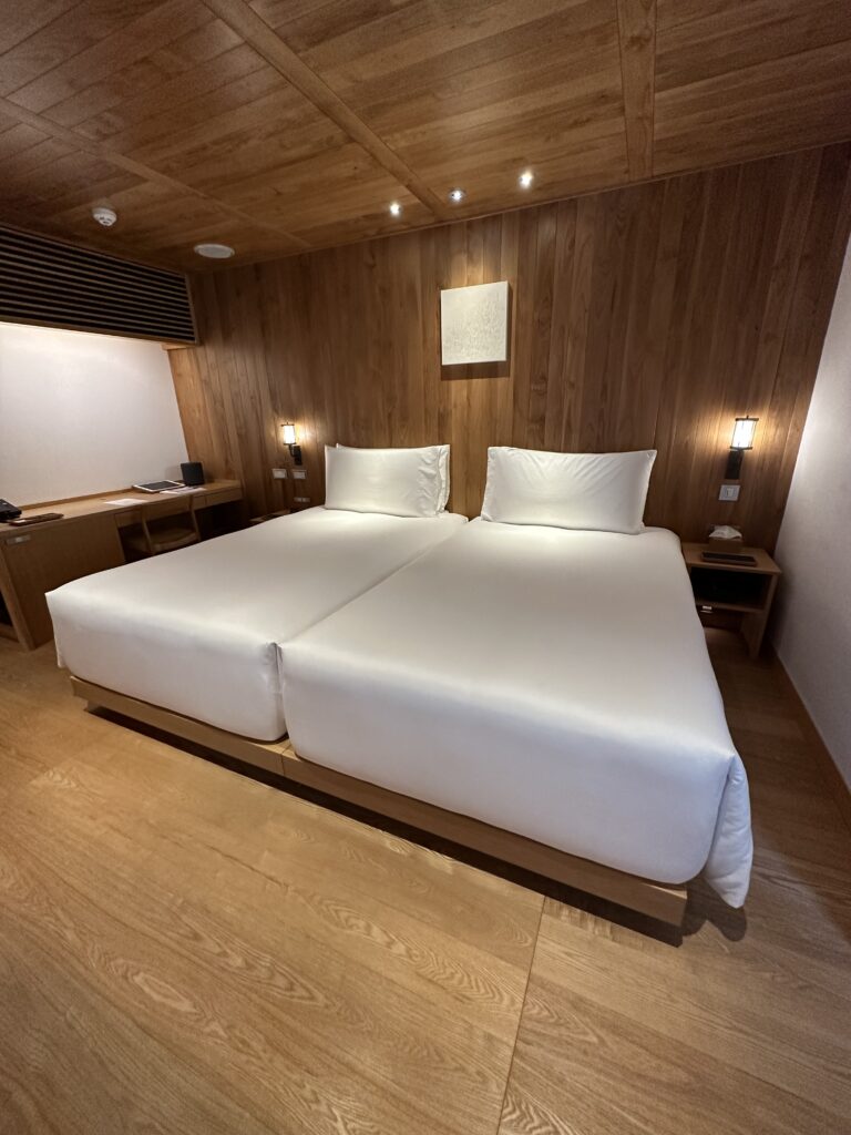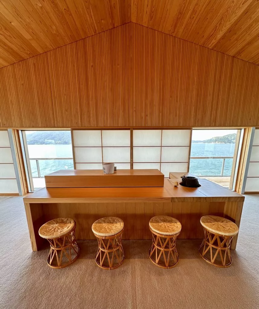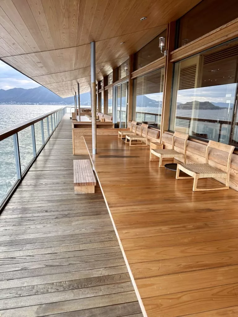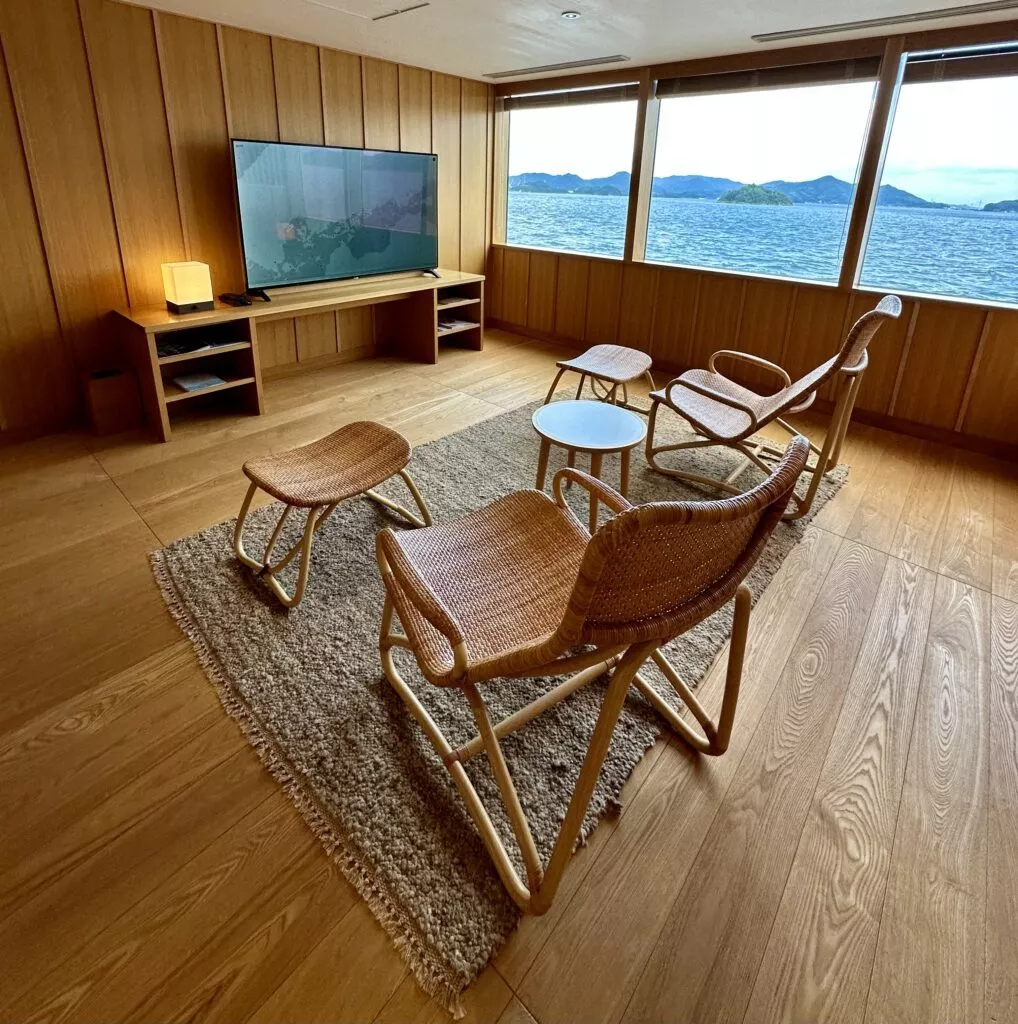 Entworfen vom Architekten Yasushi Horibe in Anlehnung an den komfortablen und minimalistischen Stil eines japanischen Ryokans, versprüht das Schiffshotel als „floating ryokan“ mit seinem warmen, holzgetäfelten Interior ein einladendes Ambiente und verbindet so Tradition und moderne Eleganz auf mühelose Weise. 19 luxuriöse Suiten – beziehungsweise Kabinen – befinden sich im Innern des Schiffs, das auf der Seto-Inlandsee unterwegs ist. Alle Suiten besitzen eine private Terrasse sowie einen Blick aufs Meer. In der gehobenen Kategorie sind sogar private Bäder unter freiem Himmel Teil der Ausstattung.