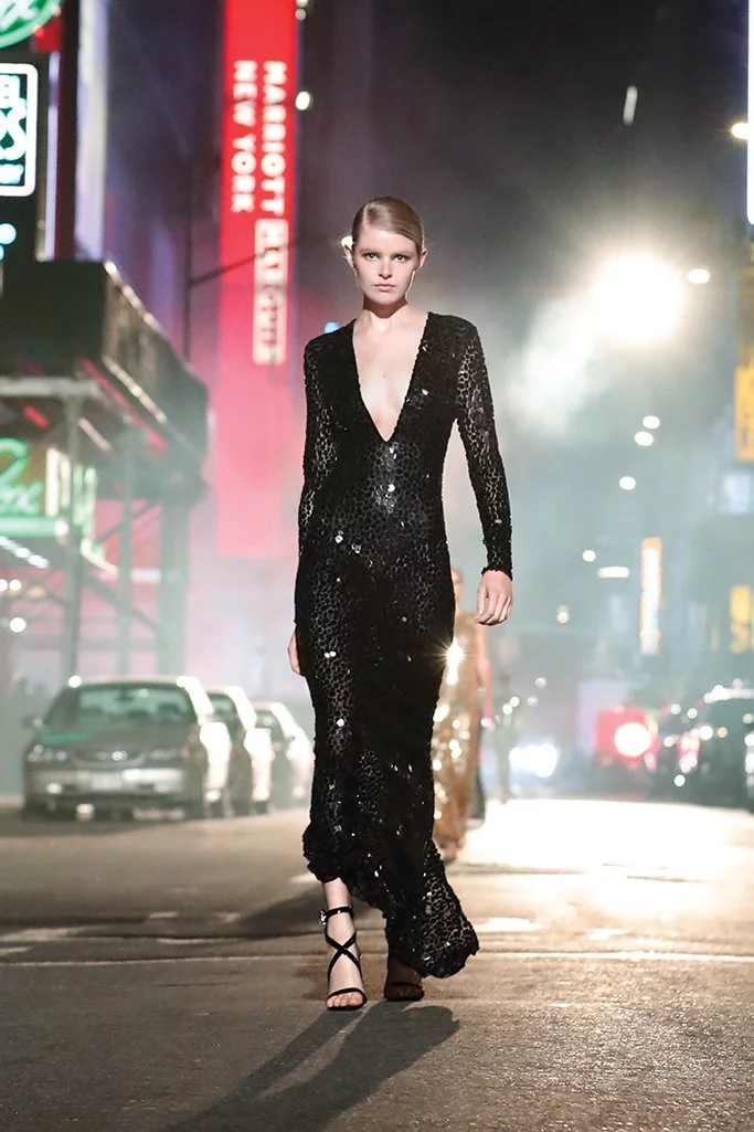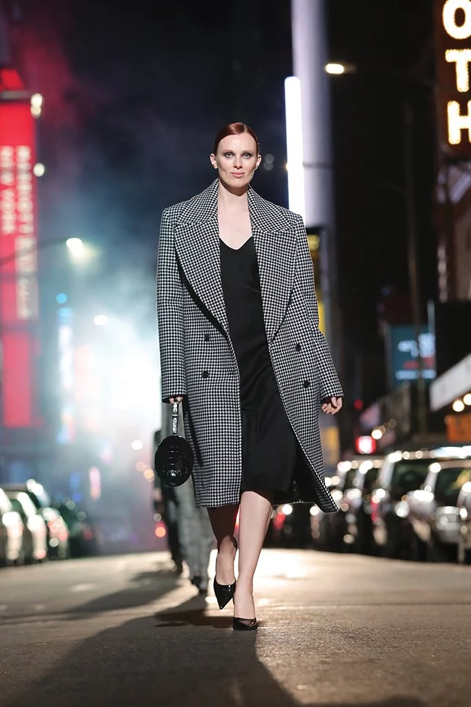 Mit dieser Kollektion feiert der amerikanische Designer sein 40-jähriges Jubiläum. Ein kleines Novum in der schnelllebigen Modebranche. Doch seine aktuellen Kreationen beweisen erneut: Michael Kors ist ganz nah am Zeitgeist. Luxuriös, ohne an Lässigkeit zu verlieren. Urban, aber dabei immer Glamourös. Neutrale Nuancen wie Schwarz, Weiß, Kamel und Elfenbein werden durch schimmerndes Rot und metallischen Glanz in Silber und Gold akzentuiert. Bürotauglich: scharfe Nadelstreifen und Hahnentritt. Schlanke Hosenanzüge und Cashmere-Pullover – für kalte Tage – der übergroße Puffermantel. Für den Abend dann stiefellange Röcke mit Beinausschnitt, glanzvolle Plongé-Kleider und Pailletten-besetzte Abendroben.
