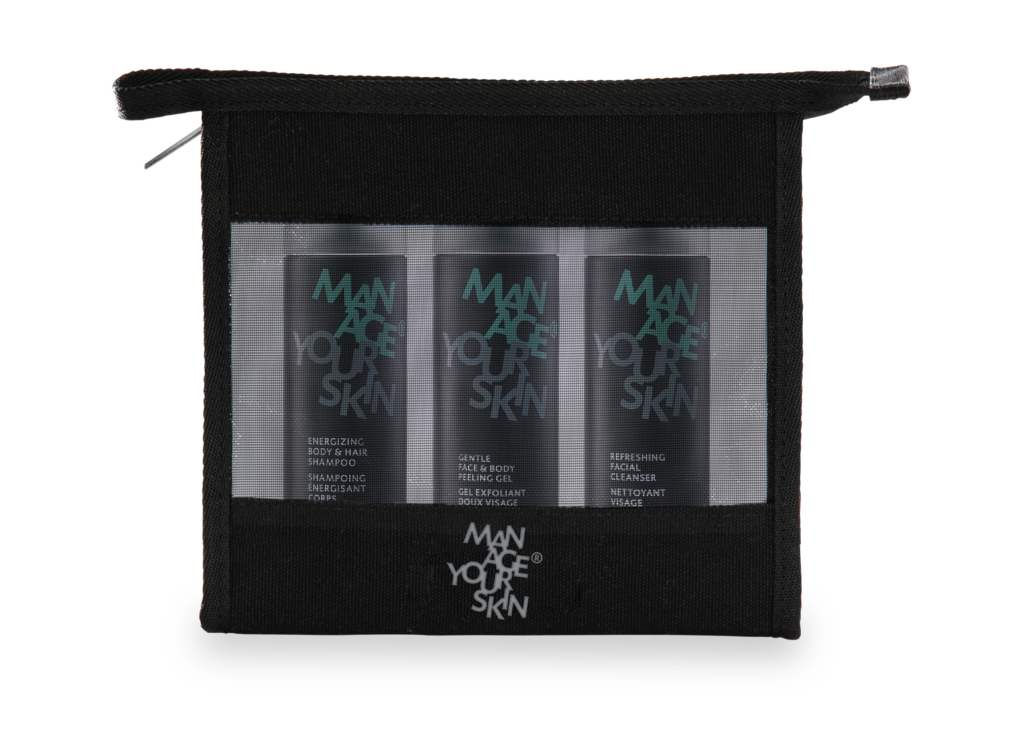 Ideal ausgerichtet auf die Bedürfnisse der Männerhaut, sind das Energizing Body & Hair Shampoo in Originalgröße sowie der Refreshing Facial Cleanser und das Gentle Face & Body Peeling in XL-Sondergrößen in einer praktischen Kosmetik-Bag zusammengestellt.