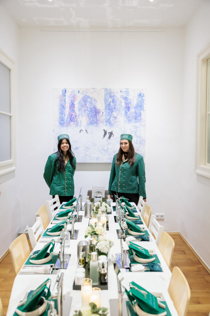 Nach Kunst und Kulinarik nahmen die Gäste an einer langen Tafel Platz, um vom einzigen Mann in der Damenrunde in die Geheimnisse der Schönheitspflege eingeweiht zu werden, dem Ambassador von La Mer, Marc Müller. Mit viel Passion zelebrierte Marc Müller die La Mer Pflegeroutine, lieferte spannende Details zu den einzigartigen Wirkstoffen wie der Miracle Broth™ und beantworte Fragen zur individuellen Pflegeroutine der Damen. „Ich fühle mich wie zu Hause“, so das Fazit von Sonja Lechner, „umgeben von Kunst bei gutem Essen abendliche Pflegerituale zu zelebrieren, gehört auch zu meiner täglichen Routine, ist aber freilich in Begleitung inspirierender Frauen viel beglückender!“ Das sahen die Gäste genauso und so ist es ein Glück, dass der La Mer After Work Art Cocktail im Herbst in die zweite Runde geht und künftig zwei Mal pro Jahr Bildende Kunst und die Kunst der Schönheit erneut miteinander verbinden wird.