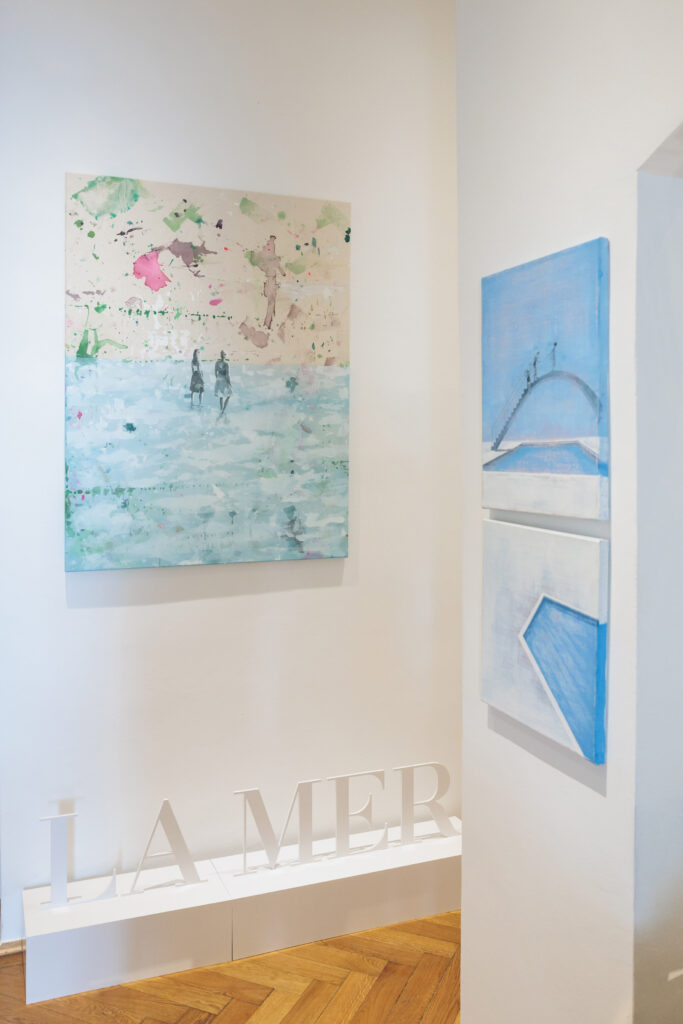 Schönheit zelebrierte Sonja Lechner auch mit dem Kleid von Bellasor, das sie trug – ein ganz junges Label aus Hamburg. Die Geschäftsführerin von Bellasor, Anna-Lena Bundt: „Mode, Kunst und Schönheit – ein perfekter Dreiklang für unser Label! Frau Dr. Sonja Lechner trägt das Kleid LARA in hellblau: Ich habe das Blau des Sommerkleides schon im Blau des Meeres in den Werken von Iris von Carnap wiederentdeckt und aus dem Meer stammen ja auch die Ingredienzien von LA MER!“ Kulinarisch ummantelt wurde die Einladung von Panta Rhei: Geschäftsführerin Sonja Friedl hatte das Thema Fermentierung in ihrem Fingerfood umgesetzt: „Algen spielen ja eine wichtige Rolle für die Herstellung der Kosmetik von LA MER und so habe ich mit meinem Team entsprechende Köstlichkeiten für den heutigen Empfang kreiert.“