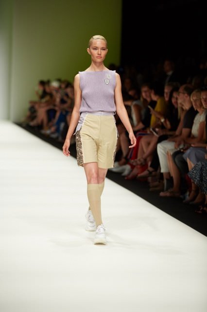 Die Farbplatte: Weiß, Creme und Beige treffen auf Tannengrün und Flieder. Ein schönes Detail sind reiche Wollgarnstickereien, die an die Strukturen der Natur angelehnt sind. Kantige Anzüge und kurze Shorts erinnern hier an die strengen Uniformen der Pfadfinder. Glencheck und Baumwollblusen mit Karomuster lockern das Ganze.