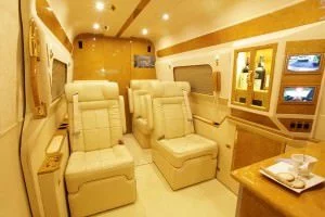 Der Wagen ist zur Sicherheit der Fahrgäste gepanzert. Im Innern verbergen sich exklusive Ledersessel, eine eigene Bar, eine kleine Küche, Marmorböden sowie ein Luxus-Bad mit einer Toilette aus Keramik. Überall verbergen sich ausfahrbare Fächer, die zum Beispiel eine Espresso-Maschine beinhalten oder aber Touch-Displays, mit denen man unter anderem den 3D-Fernseher bedienen kann. Die obligatorischen iPads dürfen an Bord natürlich ebenso wenig fehlen.