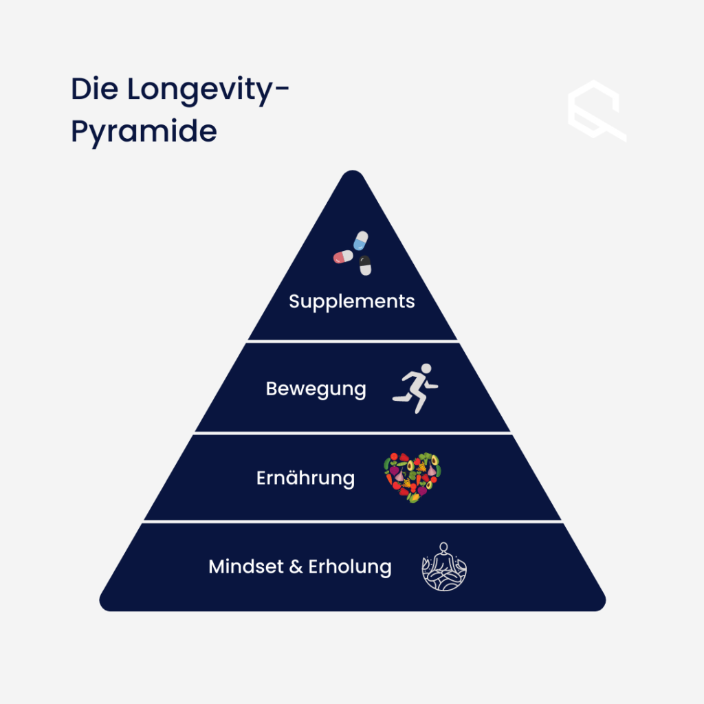 Vierter, und für uns wichtigster Punke: Die Ergänzung von Supplements ist dann sozusagen die Spitze der Pyramide und kann alle Bereiche positiv bestärken. Viele Vitalstoffe und Moleküle in unserem Körper nehmen mit zunehmendem Alter ab. Hier kommen unsere Nahrungsergänzungsprodukte ins Spiel.