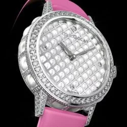 Das Zifferblatt wiederum besteht aus 92 Golay Perlen und aus 4 Brillanten. Das Armband ist aus Satin und die Dornschließe wiederum aus Weißgold.