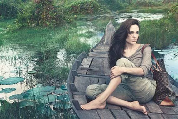 Dementsprechend fotografierte Annie Leibovitz Angelina Jolie in einem Boot im Sumpf von Vietnam, in der Provinz, in der sie einst ihren Sohn Maddox adoptierte. Seitdem engagiert sie sich hier für humanitäre Projekte. Auf dem Bild trägt sie ihre eigenen Kleidungsstücke, nicht welche von Louis Vuitton, und zudem eine LV-Tasche, die sechs Jahre alt und nicht mehr auf dem Markt ist. (Wobei man schon hört, das sie daraufhin wieder neu aufgelegt werden soll)