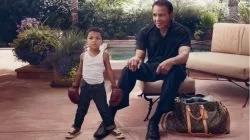 Nun reiht sich hier also auch Muhammad Ali ein. Er stimmte zu, dass Annie Leibovitz ihn zusammen mit seinem Enkel in seiner Villa in Arizona ablichtet. Auf dem Bild blickt Ali stolz seinen Enkel an, der mit Boxhandschuhen aussieht als wäre er bereit in den Ring zu steigen. Neben Ali steht der Louis Vuitton Keepall Weekender Bag, gefüllt mit Trainingssachen. Das Motto lautet: „Some stars show you the way. Muhammad Ali and a rising star“.