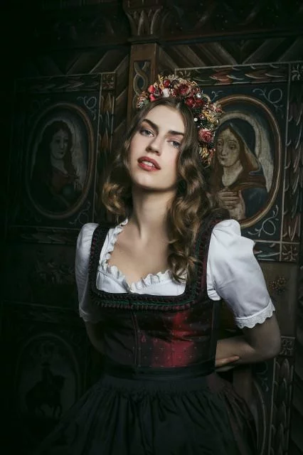 Das Seidendirndl „Theresia“ lockt mit schöner Herzrüsche am Ausschnitt. Die Leinen-Baumwolldirndl „Vivienne“ und „Heidemarie“ haben zwei Wendeschürzen. Das Dirndl „Elodie“ ziert ein provenzalischer Stoffdruck, und „Trudi“ zeigt ein mit Froschgoscherl verziertes Dekolleté.