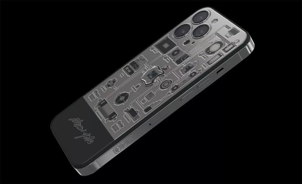 In der Mitte des Gehäuses aus Luftfahrt-Titan befindet sich eine versiegelte Kapsel in Form des eines angebissenen Apfels mit einem eingebetteten Fragment der Hauptplatine des allerersten iPhone 2G. Die Rückseite des Smartphones ist mit einer hochpräzisen Gravur verziert, die die technischen Elemente des Geräts darstellt. Diese streben zum Zentrum der Welt – dem Apple-Logo – wie ein Kreislaufsystem, das das Blut zum pulsierenden Herzen treibt.