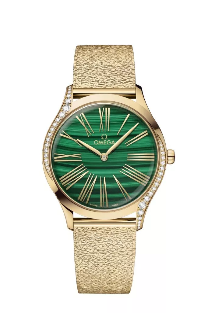 Das 36-mm-Gehäuse aus speziellem 18K MoonshineTM-Gold ist bei beiden neuen Trésor-Modellen seitlich mit den charakteristischen 38 Diamanten im Brillantschliff besetzt, die seine geschwungene Form elegant hervorheben. Um dem Uhrendesign noch mehr Ausdruck zu verleihen, hat OMEGA eigene römische Stundenmarkierungen für das Malachit-Zifferblatt kreiert. Besonders luxuriös ist die Variante mit einem Mesharmband aus 18 K MoonshineTM-Gold, hier liegt die unverbindliche Preisempfehlung des Herstellers bei 31.100 Euro.