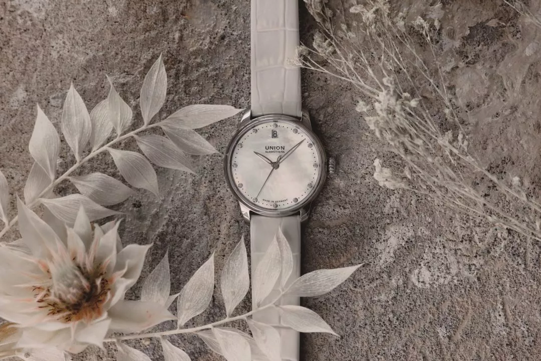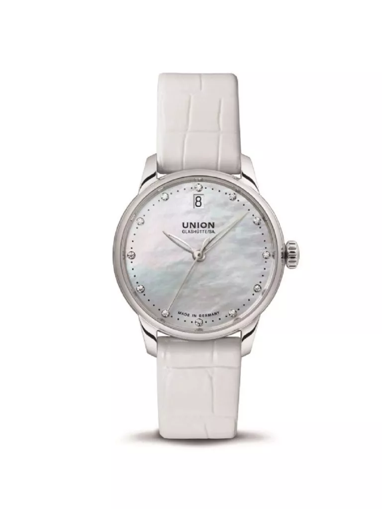 Perfekt für Damen, die edle, feminine Formen schätzen und dennoch nicht auf die Eigenschaften einer mechanischen Uhr verzichten möchten: Die Seris Datum von Union Glashütte besticht mit Perlmuttzifferblatt und 12 Diamanten als Indizes. Die dezente Gestaltung hebt sich durch ein couragiert positioniertes Datum bei 12 Uhr ab. Zwei Wechselarmbänder lassen die Trägerin den Look je nach Outfit und Anlass individuell wählen. Die unverbindliche Preisempfehlung des Herstellers liegt bei 2.250 Euro.