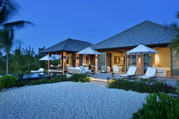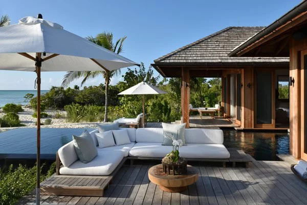 Die Villen mit Meerblick kombinieren ein helles, leichtes Interior mit modernen Akzenten aus Teakholz. Einige haben einen eigenen Pool. Im unberührten Teil der Insel finden sich auch größere Standhäuser, alle mit privaten Pools versehen.