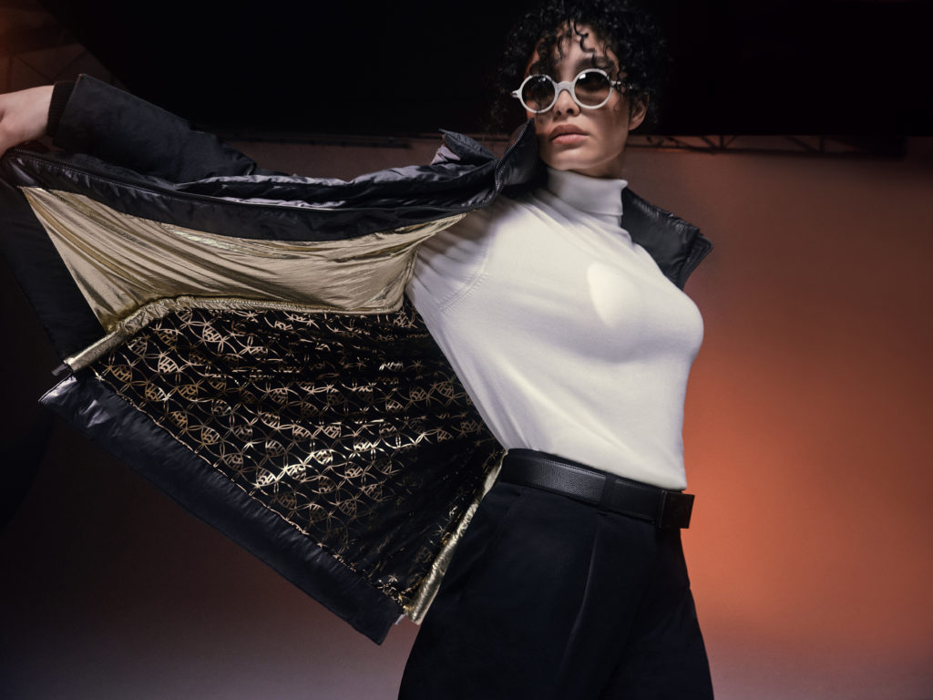 THE GLAM I ist eine trendige Damenjacke mit Kapuze und einer eleganten Passform; diese ist am Rücken länger geschnitten und mit seitlichen Reißverschlüssen für zusätzlichen Komfort ausgestattet. (links oben)