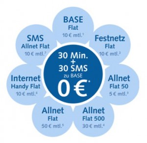 Auch ohne diesen Service zeichnet sich der Tarif Mein Base durch attraktive Konditionen aus. Wie für ein Prepaid-Angebot typisch verzichtet der Anbieter auf eine Grundgebühr. Jedoch liegt die Mindestlaufzeit bei 24 Monaten. Als kleines Extra gewährt der Provider jeden Monat 30 Freiminuten oder 30 Frei-SMS ins E-Plus Netz. Eine Gesprächsminute schlägt mit 19 Cent zu Buche. Die Taktung ist 60/60. Auch Kurzmitteilungen können zum Preis von 19 Cent verschickt werden.