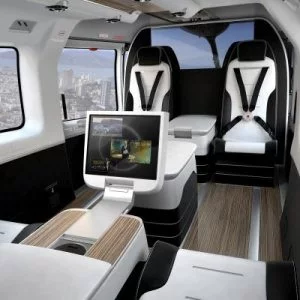 Besonderes Augenmerk wurde auf den Innenraum des Hubschraubers gelegt. Dieser ist edel verkleidet, inspiriert von der R-Klasse und bietet dank verschiebbaren Sitzen auf Schienen genug Platz. Auch einen Kofferraum gibt es, zum Beispiel für Gepäck oder die Golfaussrüstung. Und natürlich wird es in der Luft nie langweilig, denn über einen 15 Zoll Monitor kann man mit dem DVD-Player Filme ansehen oder einfach in die Kühlbox zu einem Fläschchen Champagner greifen.