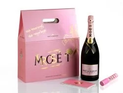 Der Moët & Chandon Rosé Impérial kommt in einem pink-farbenen Geschenkset daher. In der wunderschönen Box wartet nicht nur eine Magnumflasche Champagner auf einen, sondern auch ein pinker Textmarker und Sticker, mit denen man seine persönlichen Liebesbotschaften auf die Flasche setzen und sie dabei natürlich zu einem individuellen Kunstwerk machen kann.