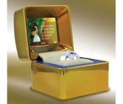 Im Deckel der Euricase Multimedia Ring Box befindet sich ein kleiner LCD Monitor und Lautsprecher, auf denen man dann gleich die passenden Bilder zum Geschenk mit Sound ablaufen lassen kann. Bis zu 500 Bilder oder eine Stunde Videomaterial passen auf die Multimedia-Schatulle.