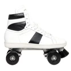 Der rollende Schuh ist im typischen Vintage-Look gehalten und erinnert an die Rollerskate-Partys der 70er und 80er Jahre. Edel und klassisch wirken die Rollschuhe von Saint Laurent durch den Schwarz-Weiß-Look.