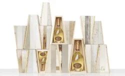 Mit dieser Art der Auslieferung war man der Konkurrenz weit voraus, die diese Methode erst mehrere Jahrzehnte später für sich entdeckte. Piet Hein Eek hat aus diesem Grund für den Ruinart Blanc des Blancs spezielle Holzkisten angefertigt. Jede von ihnen hat ihre ganz eigene Struktur und alle Unikate sind natürlich handgefertigt und signiert. Die Kisten lassen sich vom Kunden zuhause so auseinander- und wieder zusammenbauen, dass sie kleine Skulpturen ergeben.