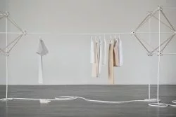 Im Raum findet sich eine Konstruktion aus Würfeln, die aus Stäben und Holzstangen geschaffen wurden. Inmitten dieser leichten, zum Teil fast schwebenden Konstruktion hängen die Kleidungsstücke von COS, die bewusst als ein Teil des Kunstwerks verstanden werden sollen. Verantwortlich für die Installation ist das französische Künstlerduo Remy Clémente und Morgan Maccari, das unter anderem durch seine Holzskulpturen bekannt wurde, die aussehen, als würden sie schmelzen.