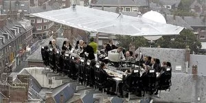 Das gesamte Dinner findet nämlich in einer Höhe von 50 Metern und das fast freischwebend in der Luft statt. Auf einer Plattform nehmen die Gäste um einen Tisch Platz (natürlich werden sie während des Essens mit Gurten gesichert), in dessen Mitte sich die eigentliche Küche befindet, in der vor den Augen der Schmausenden internationale Sterne-Köche das Menü zaubern. Dieses ganze Arrangement wird vorher aber noch mit einem Kran in die Lüfte gezogen…