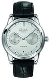 Obwohl die Senator Zeigerdatum mit 11,2 mm eine durchschnittliche Höhe hat, wirkt sie am Handgelenk äußerst flach. Dazu passen die feinen Bandanstöße und die dezente Krone mit Doppel-G-Logo. Für angenehmen Tragekomfort sorgt ein schwarzes Kalbslederband mit Ton in Ton Naht. Im Inneren des Zeitmessers sorgt das Automatik Manufakturkaliber 39-58 für absolute Präzision und mit einer Gangdauer von 55 Stunden ist die Senator Zeigerdatum ein beständiger Begleiter ihres Trägers. Als Variante zum silbernen Zifferblatt ist das Modell auch mit einem mattschwarzen Blatt erhältlich.
