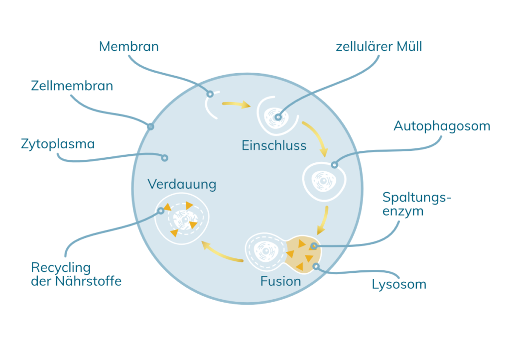 Das Stichwort lautet Autophagie: Hierbei handelt es sich um einen Prozess innerhalb einer Zelle, der überflüssige und beschädigte Zellbestandteile abbaut und gleichzeitig Eindringlinge wie Krankheitserreger oder fehlerhafte Proteine beseitigt. Die Abfälle werden in einer Art „Recyclingprogramm“ wiederverwertet, was unsere Zellen jung hält und uns unter anderem vor Krankheiten schützt. Wie viele andere körpereigenen Prozesse, verliert aber auch die molekuläre Müllabfuhr mit zunehmendem Alter an Kraft.